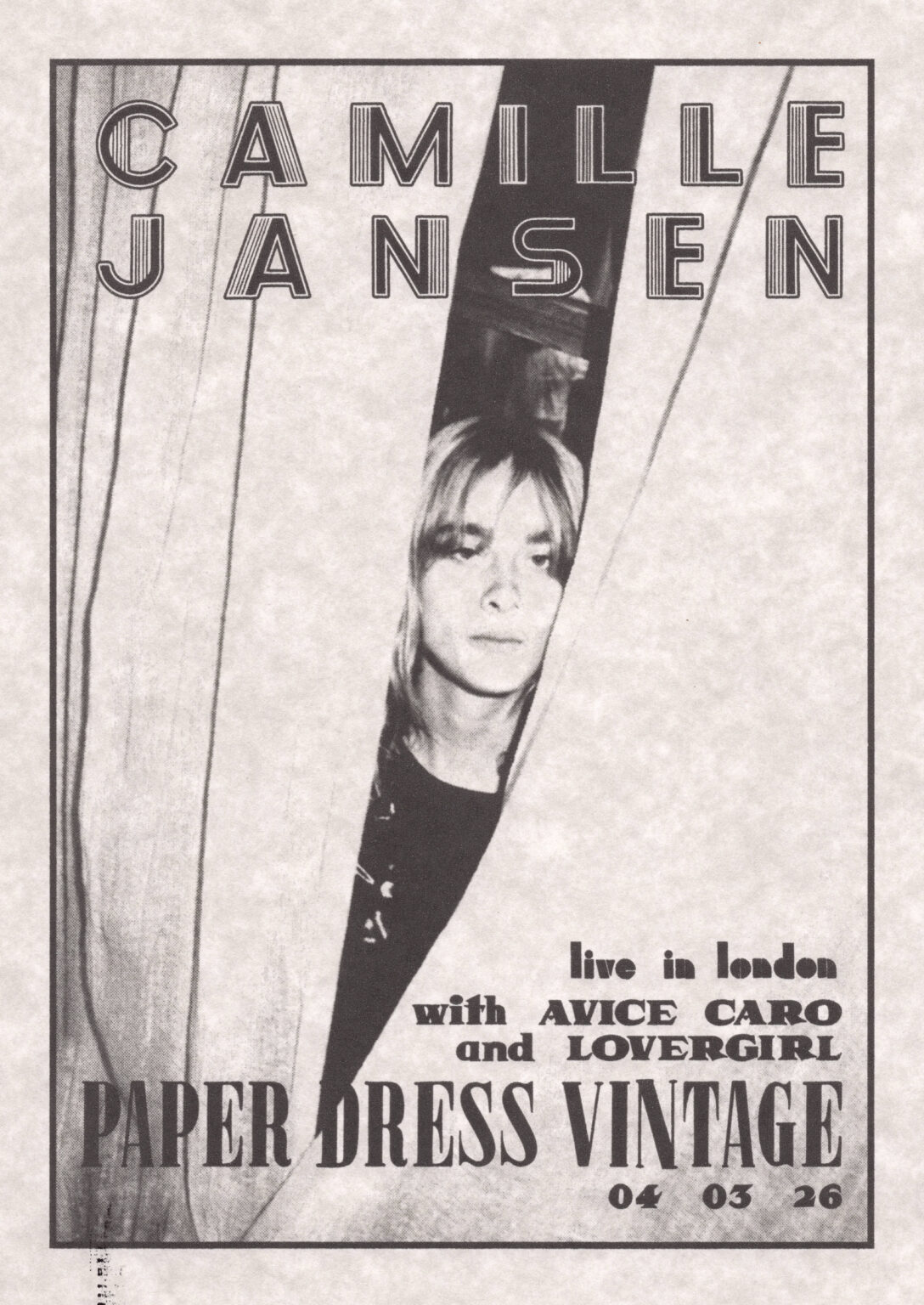 Camille’s headline show at Paper Dress Vintage will be the first of many, as she moves to share her stories and a slice of life. For this show she’ll be joined by friends Avice Caro and LoverGirl.