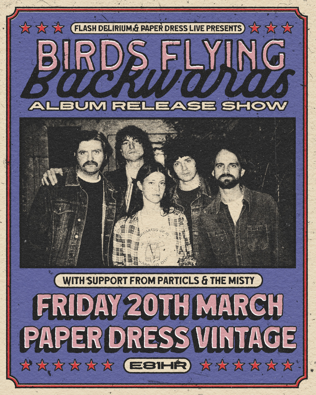 Flash Delirium & Paper Dress Live invite you to join Birds Flying Backwards‘ big album launch party! Support comes from the amazing PARTICLS and the super talented The Misty.
