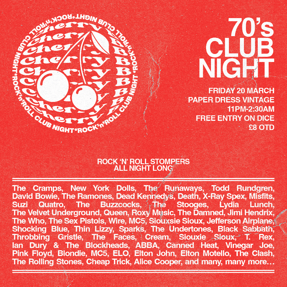 Our 70s club night Cherry B! returns to the Paper Dress dancefloor!